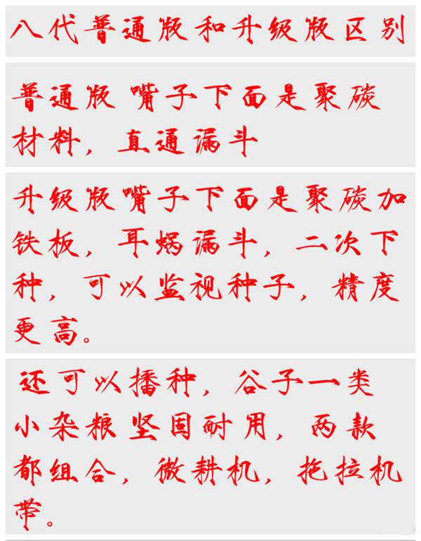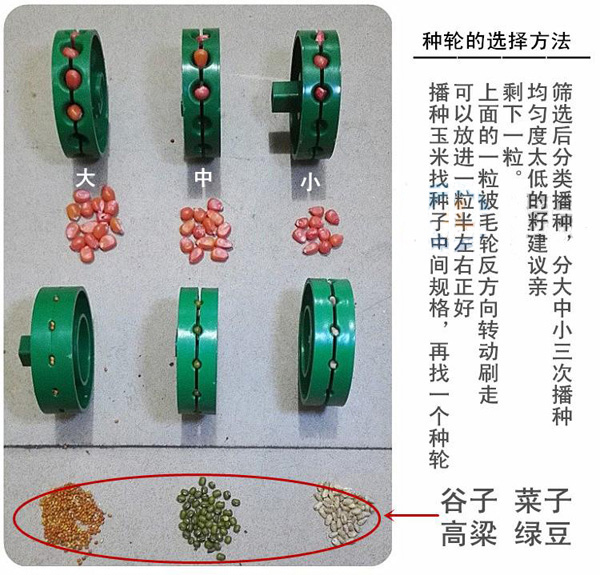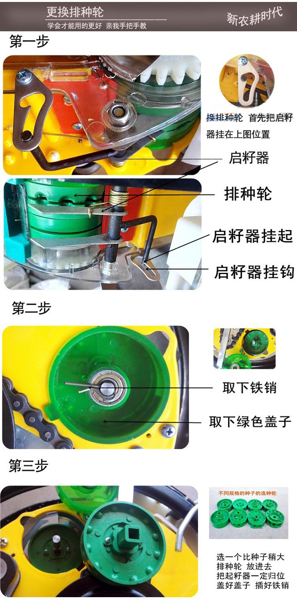 1、可以增減嘴子調整株距、根據籽的大小更換種輪。